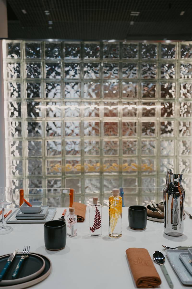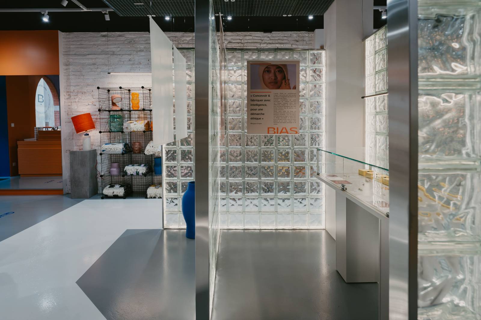Pour la box d’exposition, nous avons réalisé un immense cube en briques de verre dans lequel auront lieu des expositions plus intimistes. Une tendance qui fait son grand retour, hors des salles de bains et qui permet de créer un espace clos tout en laissant passer la lumière. Ici, House Real Time a ajouté une touche lumineuse avec des leds qui rétro-éclairent les carreaux.