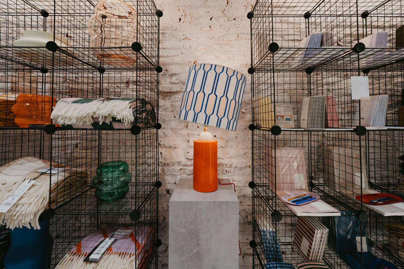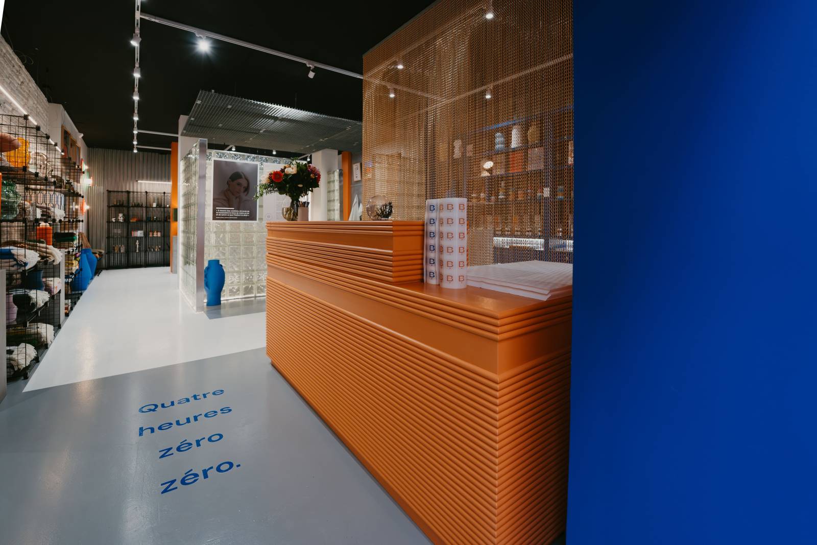 Dès l’entrée dans la boutique, vous êtes directement conquis par les couleurs emblématiques du lieu : un bleu Klein et un orange vif. On le retrouve sur des pans de murs, du mobilier et sur des touches plus discrètes qui créent une belle harmonie dans la boutique.